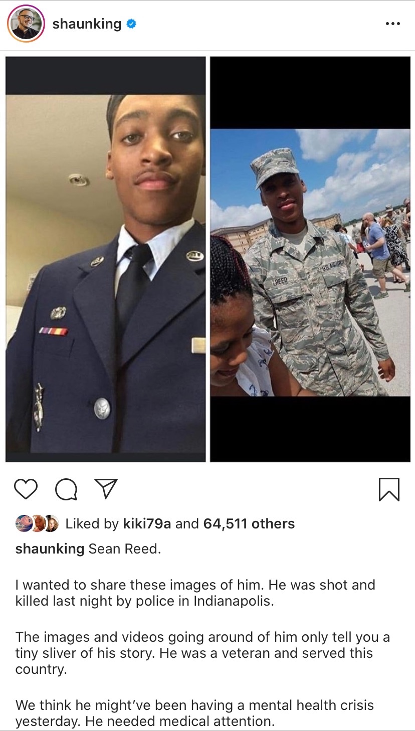 He also served in the us. The man identified as sean reed was killed by the indianapolis police near the 6200 block of michigan road on may 6 in an incident which the 21 year old inadvertently captured on camera. Reeds profile states that he was originally from indianapolis but lived in fort worth texas.