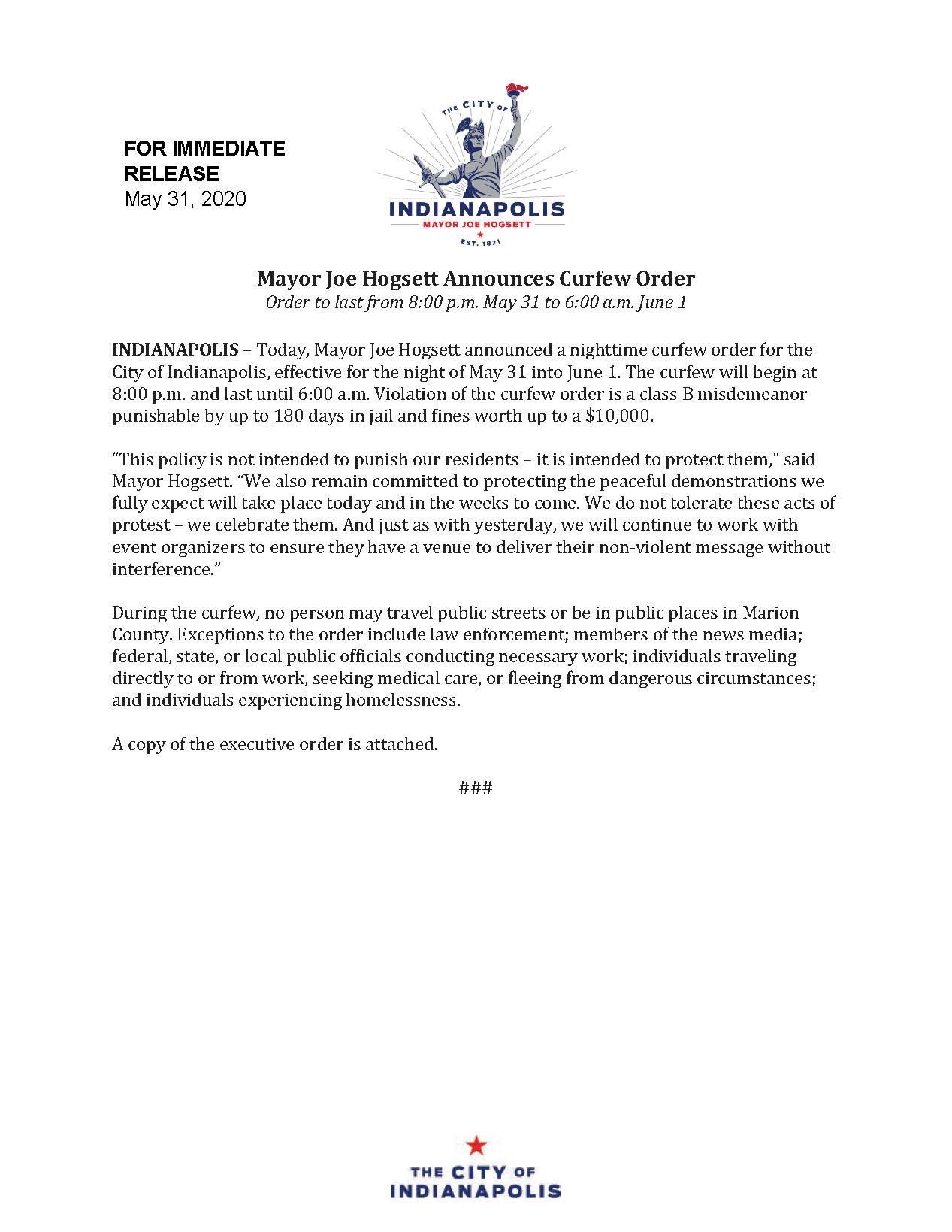 Indianapolis Protests Mayor Hogsett Reinstates Curfew For June 5 6